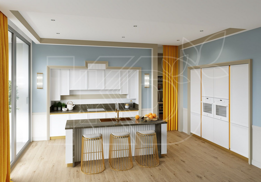 Дизайн классической белой кухни подразумевает элегантную симметрию и обилие декора. Гарнитуры украшают балюстрады и резьба, лепнина и витражи. На белоснежном фоне особенно изысканно смотрятся узоры из золотистой патины, создающие в помещении атмосферу роскоши и достатка. Фасады мебели могут иметь как матовое, так и эффектное глянцевое покрытие.