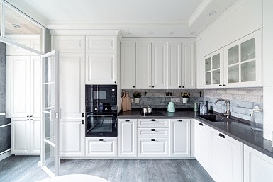 Неоклассика – еще одно направление, которое используется при оформлении кухонных интерьеров в 2023 году. Для этого стиля характерно сочетание современных деталей с классическим дизайном. Так, прямые строгие фасады, благородные спокойные оттенки комбинируются с продуманными системами хранения.