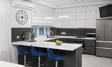 В больших помещениях устанавливают П-образные комплекты. Это отличный вариант для готовки всей семьей или дружеской компанией. Также для просторных комнат подходят модели с барными стойками: классическими, двухуровневыми, совмещенными.