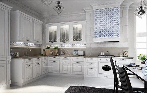 Достоинства белой классической кухни на этом не заканчиваются. Такая модель подойдет для помещений любой площади и будет гармонично сочетаться абсолютно со всеми оттенками. Это означает, что у вас не будет ограничений при выборе цвета напольного покрытия, столешницы, кухонного фартука или мебели, входящей в обеденную группу. Вы сможете проявить фантазию и сделать помещение яркими и эффектным, дополнив белый гарнитур насыщенной алой столешницей, фартуком и стульями. А можно создать спокойную умиротворенную атмосферу, оформив все пространство в приглушенных белых, бежевых, бледно-серых тонах.