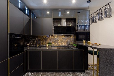Конфигурация в виде буквы «П» – идеальное решение для обустройства рабочего треугольника. При этом между плитой, холодильником и мойкой соблюдается оптимальное расстояние, обеспечивающее комфортность и безопасность в процессе пользования.
