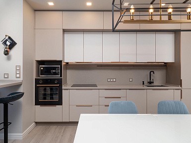 Высокие шкафы-пеналы обычно устанавливают по краям. В них можно спрятать некоторую бытовую технику, а на самые верхние полки убрать предметы, которые используются очень редко.