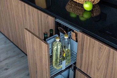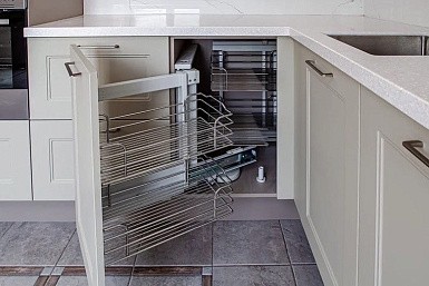 Все кухонные гарнитуры имеют рабочую поверхность, под которой устанавливают места хранения. Специалисты рекомендуют оборудовать нижние модули выдвижными полками, так как они вмещают большое количество предметов и более удобны в использовании. Традиционные ящики лучше оснастить разделителями, что обеспечит комфортное размещение предметов.