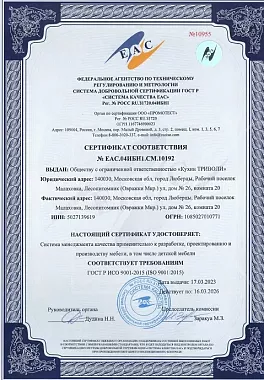 Наличие у бренда сертификатов – прямое подтверждение того, что он выпускает надежную продукцию. Так, вся продукция о т"Кухонный Двор" является обладателем международного сертификата соответствия ИСО-9001. Он подтверждает, что производство мебели соответствует признанным стандартам качества. Наличие такого сертификата позволяет бренду выйти на международный рынок, свидетельствует о корректности всех процессов при разработке, проектировании и создании мебели, а также повышает конкурентоспособность.