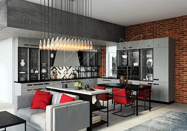 В модерне часто применяются современные материалы – закаленное стекло, хромированный металл и высокопрочный пластик. Гарнитуры в  стиле модерн оснащаются разнообразными системами для хранения и организации пространства на кухне.