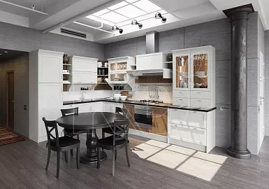 Классическая кухня отличается элегантностью, изяществом и роскошью. Подобные решения подходят для просторных помещений с высокими потолками и большими окнами. В небольших комнатах кухонная мебель в стиле классика будет смотреться несколько нелепо и вычурно из-за того, что для ее оформления используется роскошный декор – позолоченные элементы, лепнина, резьба, патина, изогнутые ручки.