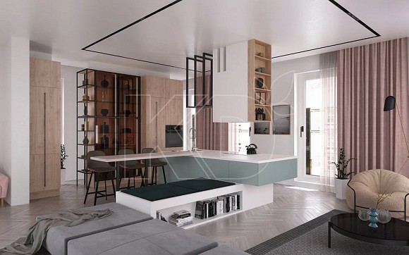 В этой же ситуации можно выбрать гарнитур с барной стойкой, которая будет отделять место для приготовления пищи и заодно служить столом для подачи блюд.
