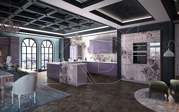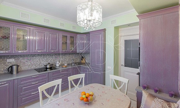 • В данной цветовой гамме выполняют также классические модели. Для них характерны четкие симметричные линии, роскошный декор. Серо-фиолетовая кухня в стиле классика обычно имеет мраморную или керамическую столешницу и изящную фурнитуру.