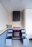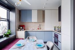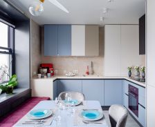 Кухня получилась «воздушной», но, вместе с тем, притягательной. За лёгкость здесь отвечает бархат фасадов и их нежная цветовая палитра. А притягательные акценты умело выставлены с помощью техники! Взгляните, в каких сочных цветах выполнены фильтр для воды, духовой шкаф и миксер! Словно яркие штрихи на монохромном полотне они попадают точно в фокус Вашего внимания. И помогают при этом постичь глубину всей композиции!